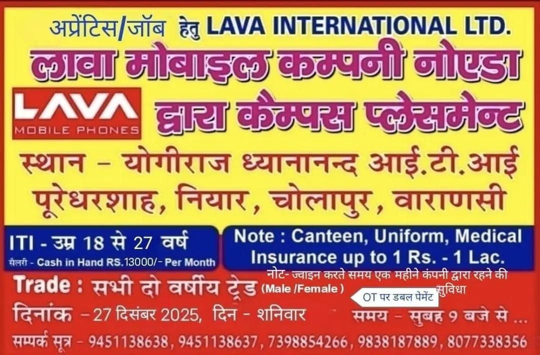 Campus Interview Location : Yogiraj Dhyanananda ITI, Puredharshah, Niyar, Cholapur, Varanasi (Uttar Pradesh)