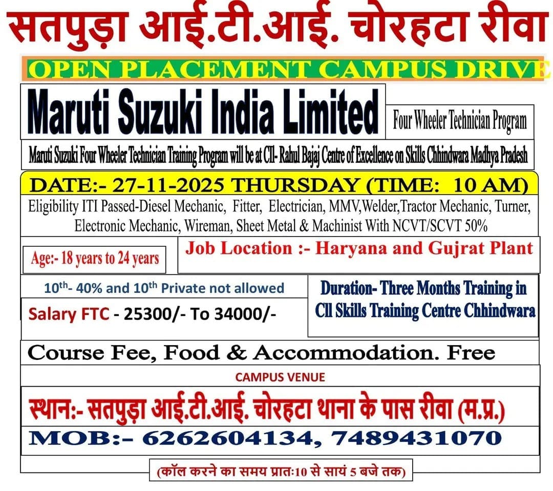 Discover exciting career opportunities with Maruti Suzuki ITI Jobs There Month Training 2025. Apply now for technician positions at Maruti Suzuki. Find out the eligibility criteria, application process, and job locations.