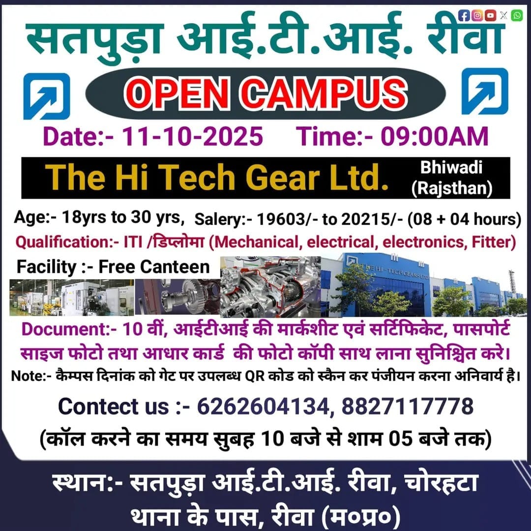 सतपुड़ा आई.टी.आई. रीवा ओपन कैंपस ड्राइव 2025 में आईटीआई और डिप्लोमा धारकों के लिए शानदार नौकरी का अवसर प्रस्तुत किया जा रहा है। यह कैंपस ड्राइव 11 अक्टूबर 2025 को सुबह 9:00 बजे से आयोजित होगी। इसमें 18 से 30 वर्ष तक के उम्मीदवार भाग ले सकते हैं। चयनित अभ्यर्थियों को ₹19,603 से ₹20,215 तक मासिक वेतन मिलेगा, जिसमें 8 घंटे के नियमित कार्य समय के साथ 4 घंटे का ओवरटाइम शामिल है।