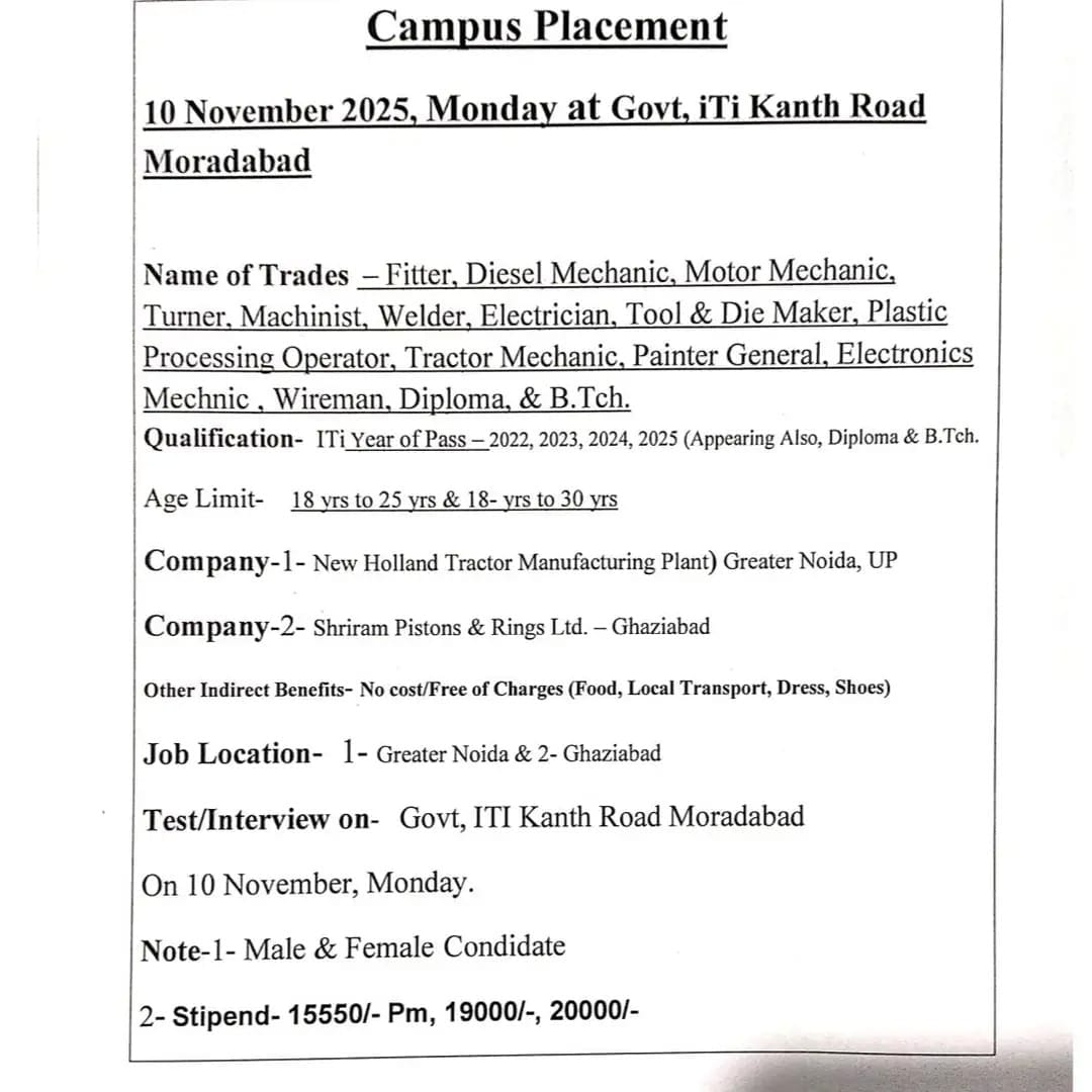 Government ITI Kanth Road, मुरादाबाद में 10 नवंबर 2025 (सोमवार) को New Holland Tractor Manufacturing Plant (Greater Noida) और Shriram Pistons & Rings Ltd. (Ghaziabad) की ओर से बड़ा Campus Placement Drive आयोजित किया जा रहा है। इस भर्ती में ITI, Diploma और B.Tech के छात्र भाग ले सकते हैं।