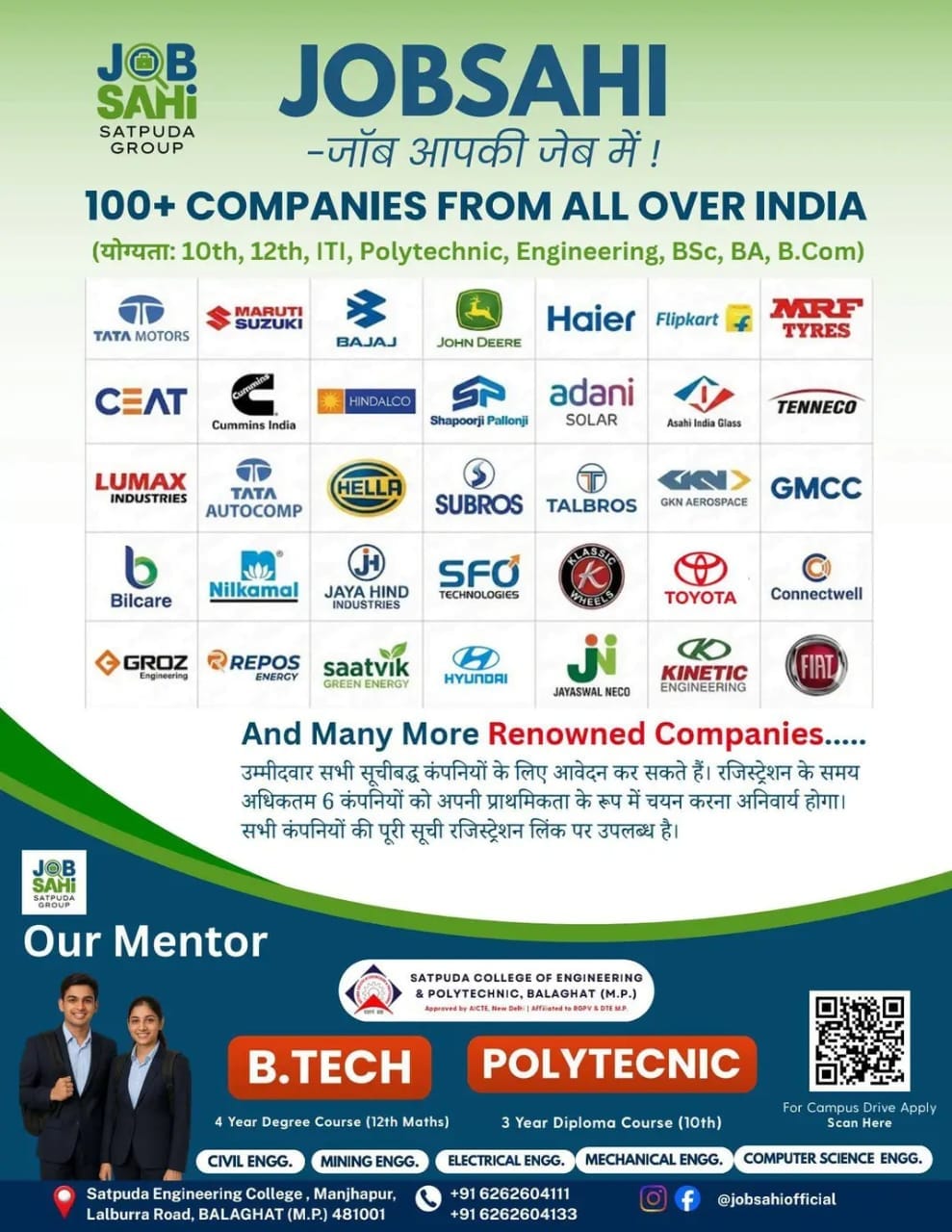Campus Interview Location : Satpuda Engineering College, Manjhapur, Lalburra Road, Balaghat (M.P.) – 481001