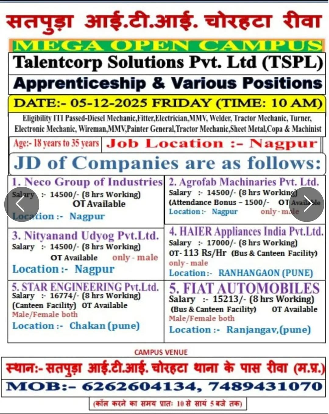 Campus Interview Location : Satpura ITI Chorhata, Near Police Station, Rewa (M.P.)