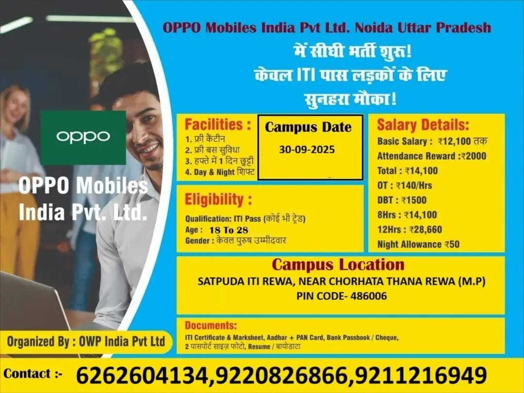 Apply for Oppo Mobile Bharti ITI Campus Placement 2025. Latest ITI jobs. Free bus, free canteen, overtime, high salary & campus drive details.