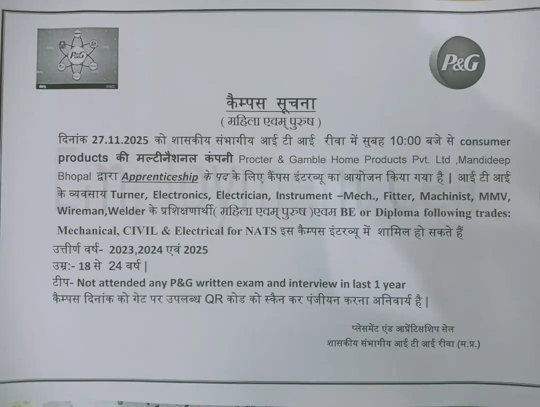 जिससे युवाओं को उद्योग आधारित ट्रेनिंग के साथ-साथ रोजगार का सुनहरा मौका मिल रहा है। यह भर्ती विशेष रूप से उन उम्मीदवारों के लिए है जो अपने तकनीकी कौशल को बढ़ाकर प्राइवेट सेक्टर में एक मजबूत करियर बनाना चाहते हैं।