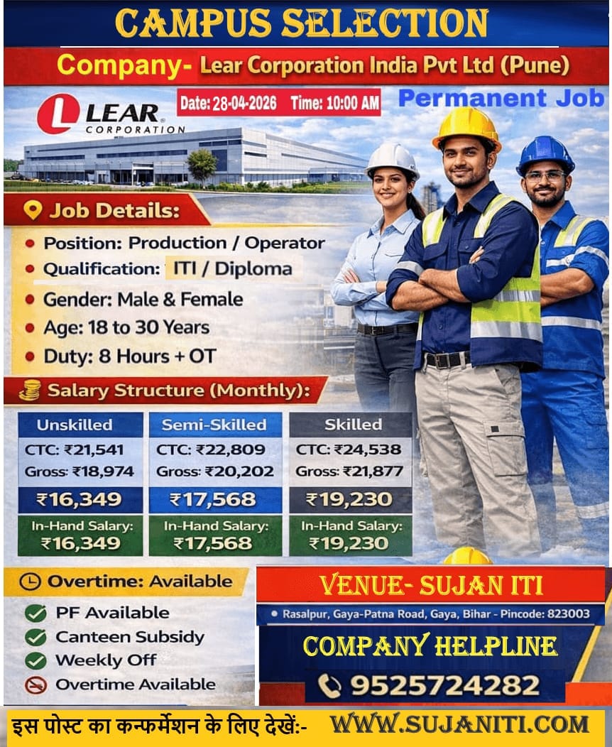 साल Private Company Permanent Job 2026 में प्राइवेट सेक्टर में स्थायी नौकरी की तलाश कर रहे युवाओं के लिए एक बेहतरीन अवसर सामने आया है। Lear Corporation India Pvt Ltd द्वारा आयोजित इस कैंपस सिलेक्शन ड्राइव में ITI और डिप्लोमा पास उम्मीदवारों को सीधे कंपनी में काम करने का मौका मिलेगा।