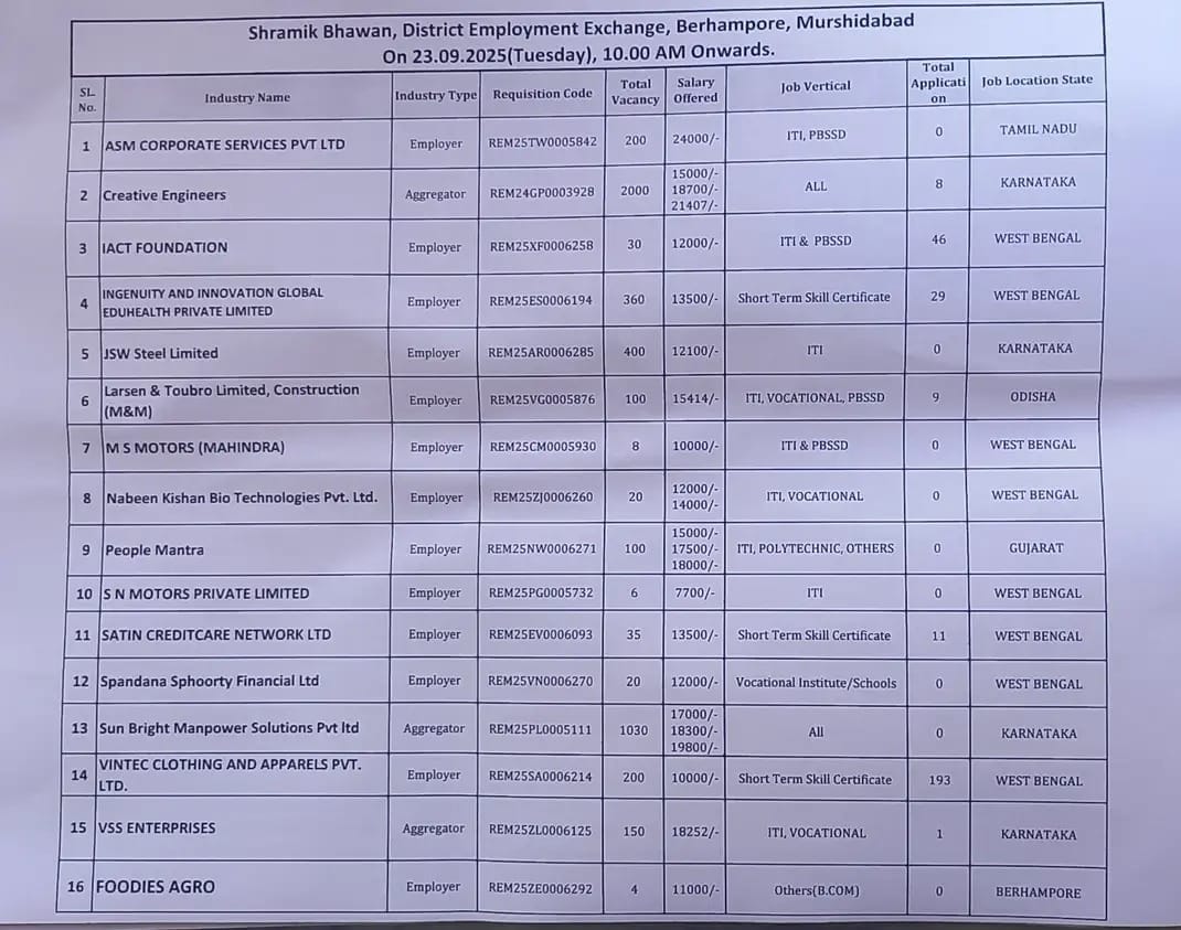Campus Interview Location : Shramik Bhawan, District Employment Exchange, Baharampur, Murshidabad