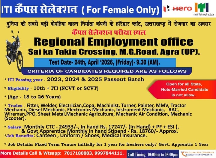 Two-wheeler manufacturing industry में career start करने के लिए एक और strong chance आया है। Hero MotoCorp के Haridwar Plant (Uttarakhand)के लिए ITI candidates का Campus Selection Drive 2026 conduct किया जा रहा है।