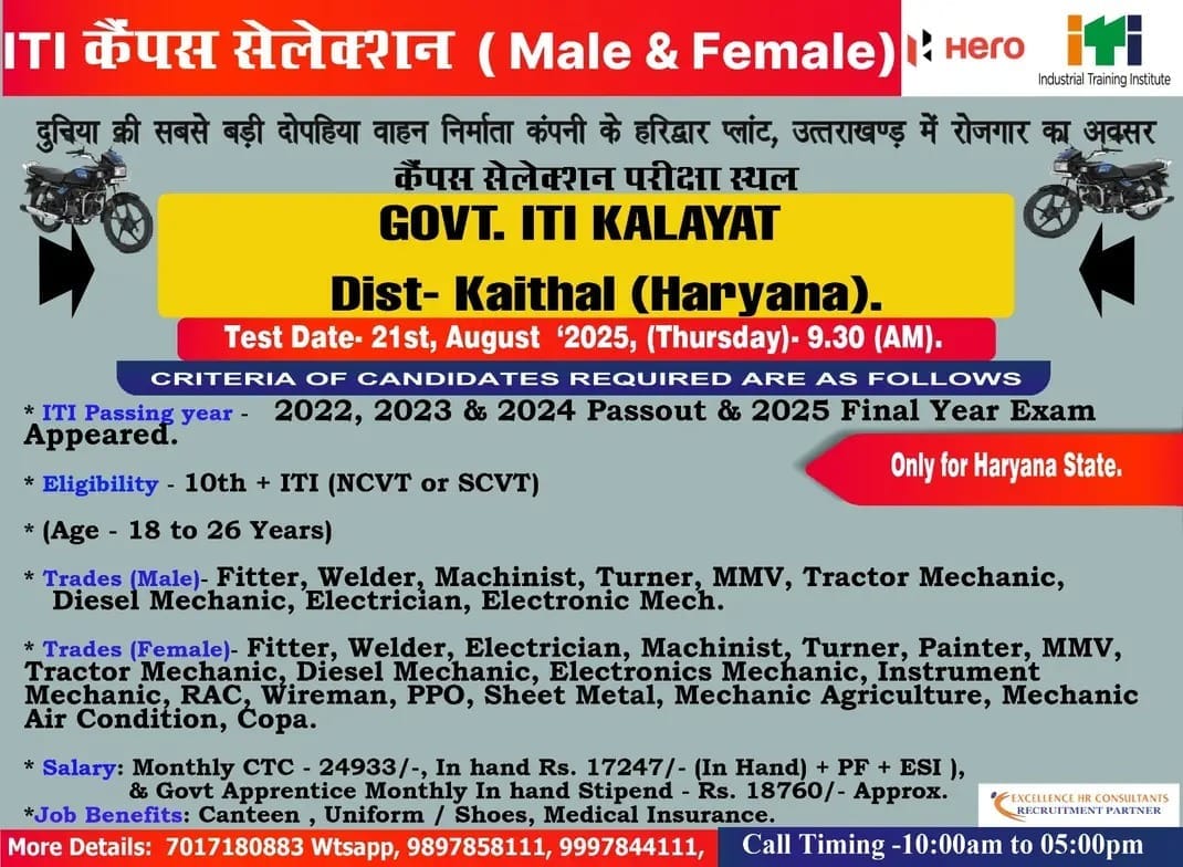 हरियाणा के पुरुष ओर महिलाओ के लिए रोजगार का सुनहरा अवसर आया है। राजकीय औद्योगिक प्रशिक्षण संस्थान कालायत में दिनांक 21 अगस्त 2025 को प्रातः 09:30 बजे से कैम्पस सेलेक्शन का आयोजन किया जा रहा है। इसमें 18 से 26 वर्ष आयु वर्ग के पुरुष ओर महिला अभ्यर्थी शामिल हो सकते हैं।