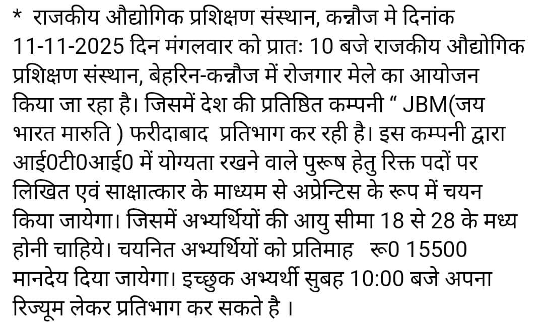 राजकीय औद्योगिक प्रशिक्षण संस्थान, बेहरिन-कन्नौज में 11 नवंबर 2025, दिन मंगलवार को प्रातः 10 बजे से रोजगार मेले का आयोजन किया जा रहा है। Private Jobs In Faridabad 2025 मेले में देश की प्रतिष्ठित कम्पनी JBM (जय भारत मारुति) फरीदाबाद भाग ले रही है।