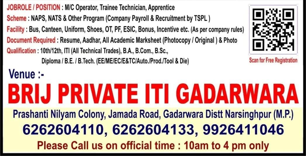 Campus Interview Location : Brij Private ITI Gadarwara, Prashanti Nilyam Colony, Jamada RoadGadarwara, District Narsinghpur (Madhya Pradesh)