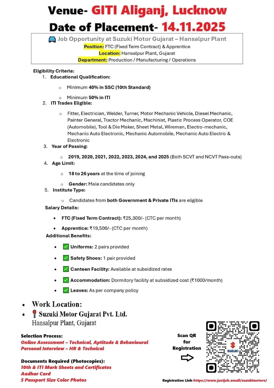 Private Jobs In Suzuki Motor 2025 के लिए आईटीआई पासआउट युवाओं के लिए सुनहरा अवसर लेकर आई है। यह कैंपस प्लेसमेंट GITI अलीगंज, लखनऊ में दिनांक 14 नवंबर 2025 को आयोजित किया जाएगा। देशभर के सरकारी एवं प्राइवेट आईटीआई संस्थानों से पास उम्मीदवार इसमें भाग ले सकते हैं। यह भर्ती सुजुकी मोटर गुजरात प्रा. लि. हंसलपुर प्लांट (गुजरात) के लिए की जा रही है, जहां चयनित उम्मीदवारों को FTC (Fixed Term Contract) और Apprentice पदों पर नियुक्त किया जाएगा।