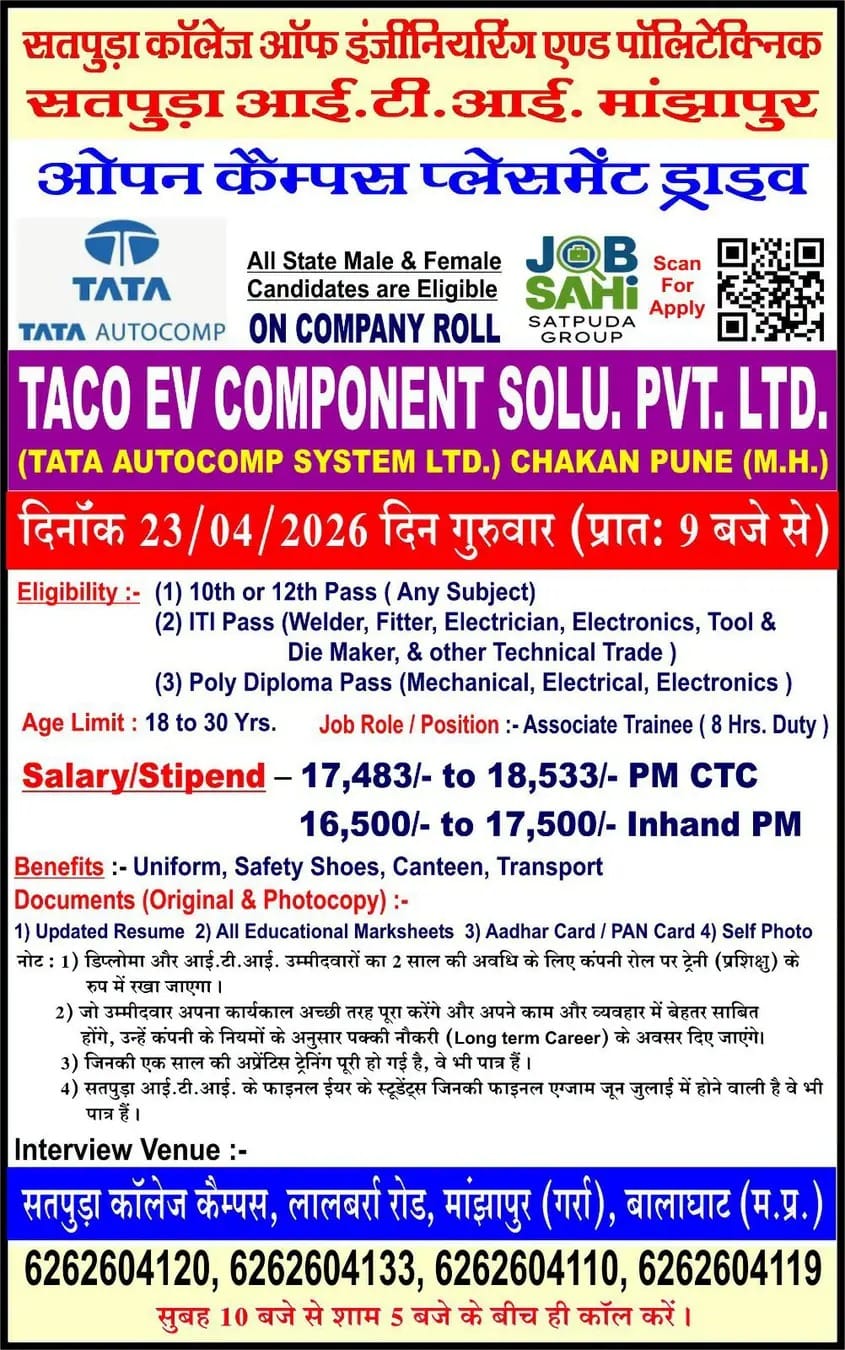 Campus Interview Location : Satpura College Campus, Lalbarra Road, Manjhapur (Gari), Balaghat, Madhya Pradesh