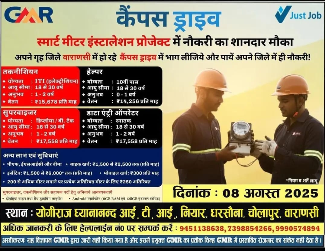 वाराणसी के युवाओं के लिए सुनहरा अवसर! स्मार्ट मीटर इंस्टालेशन प्रोजेक्ट में रोजगार पाने का शानदार मौका अब आपके अपने जिले में उपलब्ध है। आगामी 08 अगस्त 2025 को योगीराज ध्यानानन्द आई.टी.आई, नियार, धरसौना, चोलापुर, वाराणसी में कैंपस ड्राइव का आयोजन किया जा रहा है।