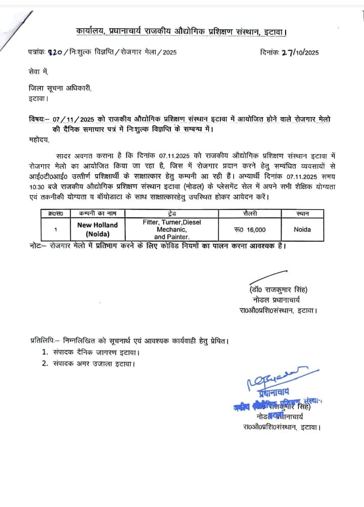 राजकीय औद्योगिक प्रशिक्षण संस्थान, इटावा द्वारा दिनांक 07 नवम्बर 2025 को एक भव्य रोजगार मेला आयोजित किया जा रहा है, जिसका उद्देश्य जनपद और आस-पास के क्षेत्रों के युवाओं को रोजगार के सुनहरे अवसर प्रदान करना है।