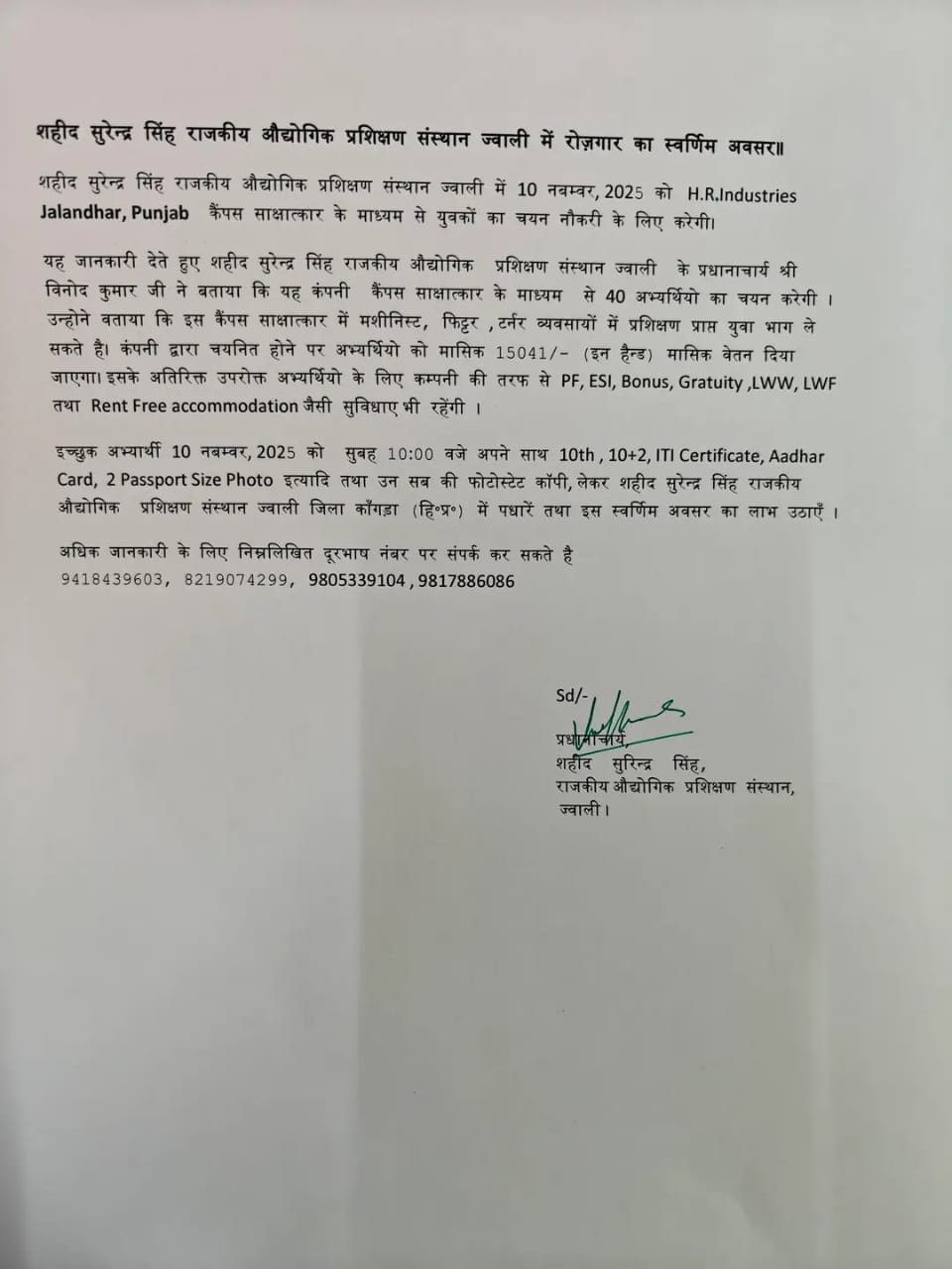 देश के युवाओं के लिए एक बेहतरीन खबर! शहीद सुरेन्द्र सिंह राजकीय औद्योगिक प्रशिक्षण संस्थान, ज्वाली (जिला काँगड़ा, हिमाचल प्रदेश) में रोज़गार का स्वर्णिम अवसर प्रदान किया जा रहा है। यहां H.R. Industries, जालंधर (पंजाब) द्वारा कैंपस साक्षात्कार के माध्यम से युवाओं का चयन किया जाएगा।