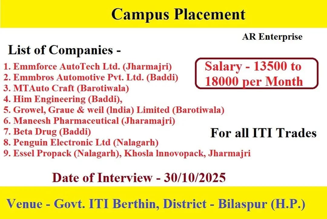 Campus Interview Location : Govt. ITI Berthin, District Bilaspur (Himachal Pradesh)