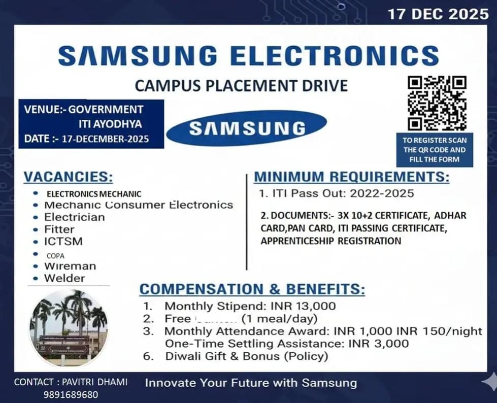 Samsung Electronics ने वर्ष 2025 में ITI पास युवाओं के लिए शानदार रोजगार अवसरों की घोषणा की है। Samsung Company Vacancies 2025 के अंतर्गत योग्य उम्मीदवारों को कैंपस प्लेसमेंट ड्राइव के माध्यम से चयनित किया जाएगा। यह भर्ती उन छात्रों के लिए बेहतरीन मौका है जो Electronics Mechanic, Electrician, Fitter, Wireman, Welder, COPA और ICTSM जैसे ट्रेड्स से ITI पास कर चुके हैं।