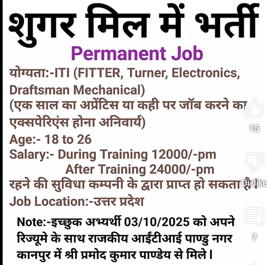 ITI Permanent Job Vacancy in Sugar Mill 2025