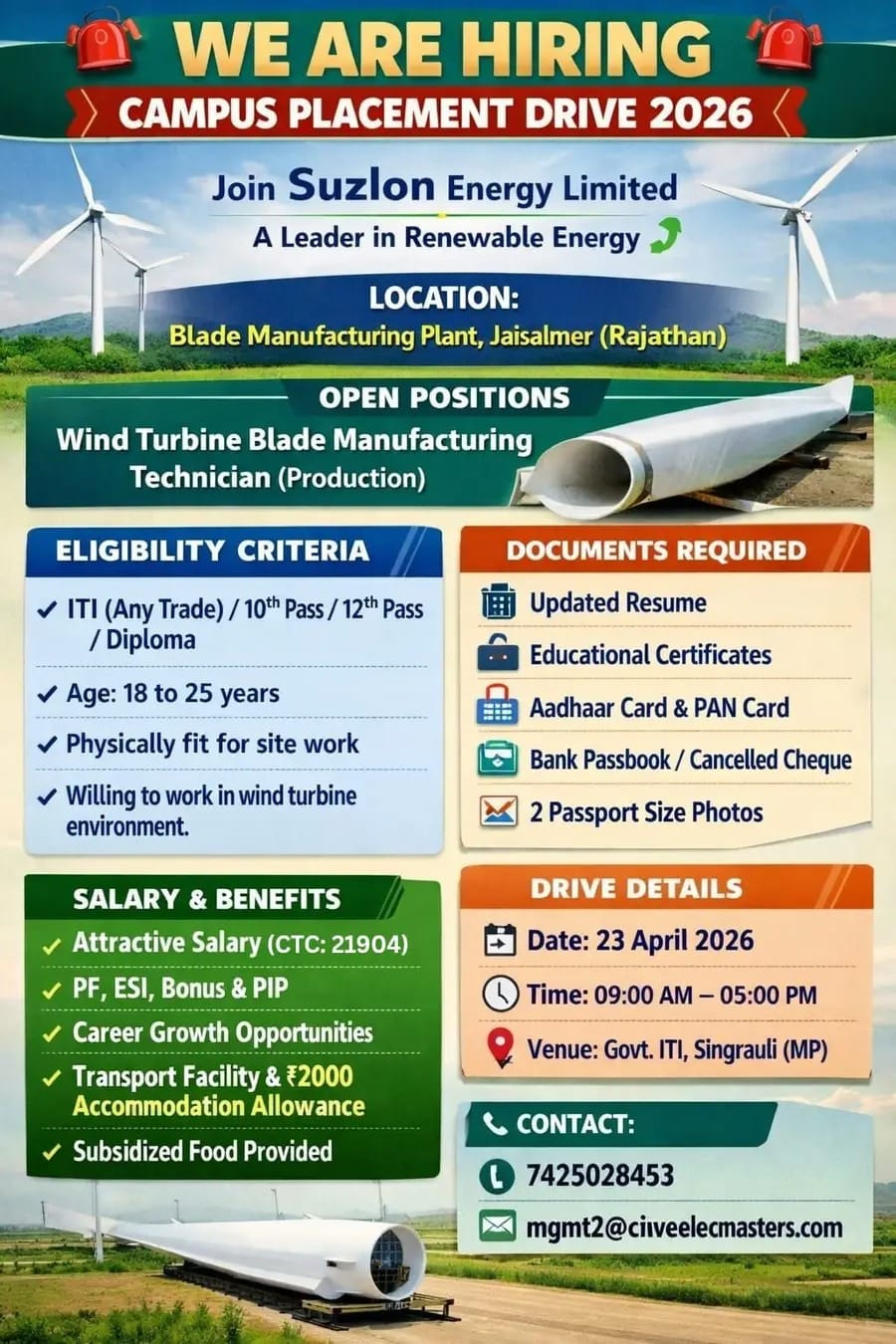 Apply for Suzlon Energy Recruitment 2026. ITI, 10th, 12th pass candidates can attend campus placement drive. Salary ₹21,904 with benefits.