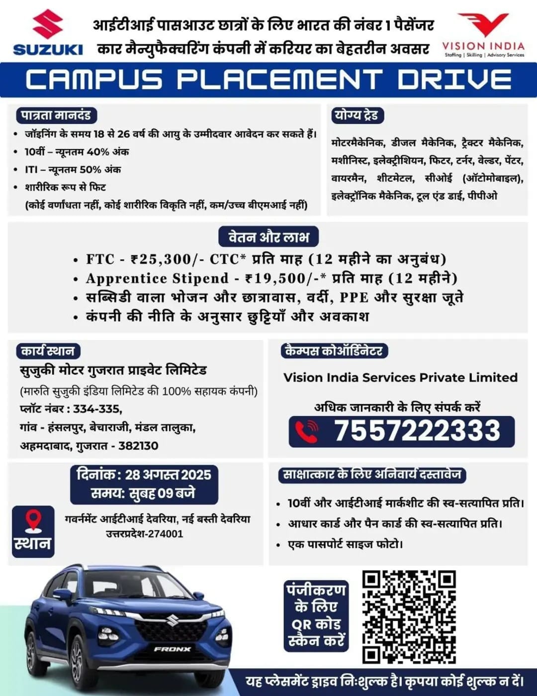 - Suzuki Motor Job Placement Free Campus Placement Drive On 31 July 2025 In Gauri Shankar ITI For ITI Pass Male Candidates.
