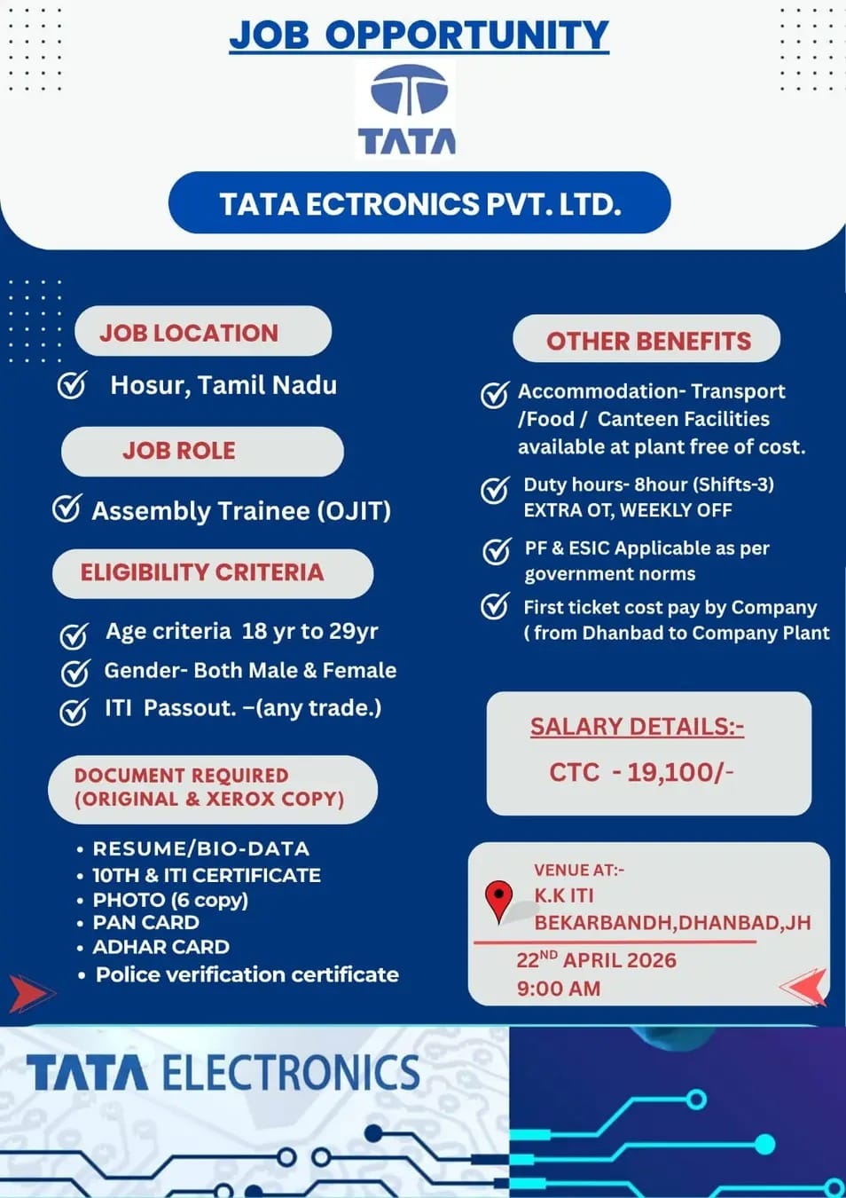 Tata Electronics Vacancy 2026 for Male & female candidates. Check eligibility, salary ₹19100, age limit, qualification and job location Hosur Tamilnadu.