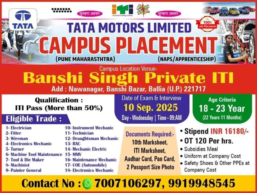 Campus Interview Location : Banshi Singh Private ITI Navanagar, Banshi Bazaar, Ballia (Uttar Pradesh)