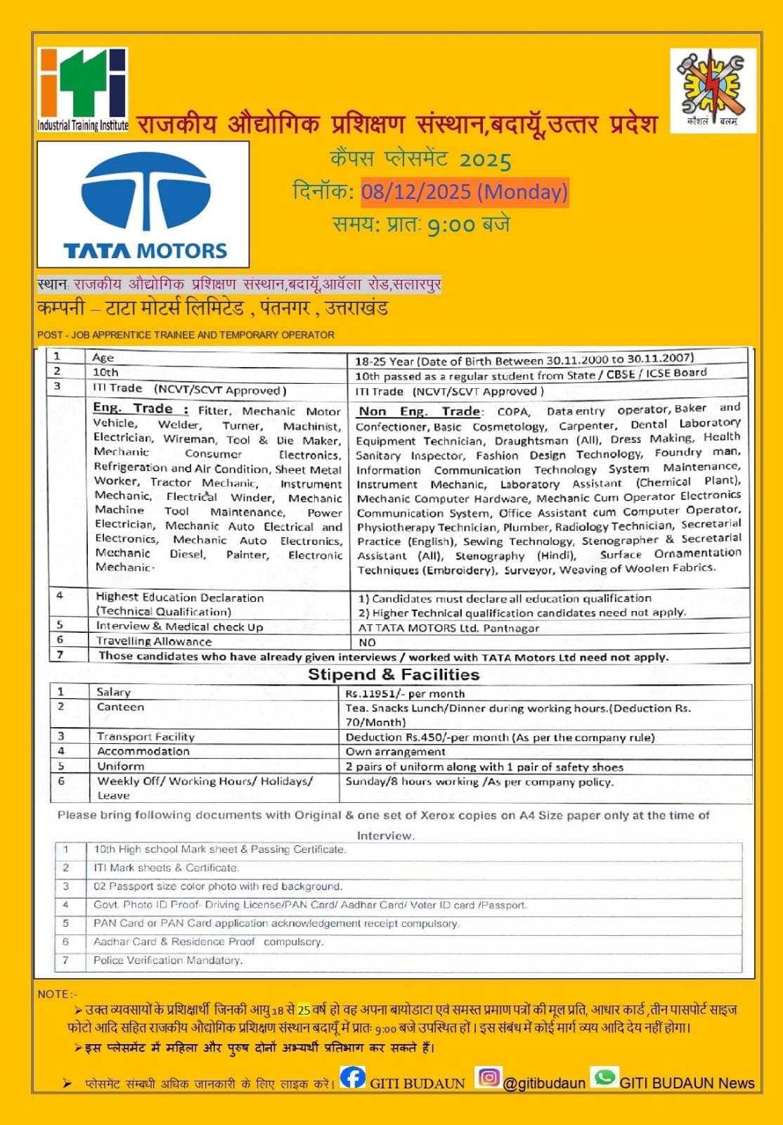 - उम्मीदवारों को सुबह 09:00 बजे तक Government Industrial Training Institute, BadaunAvenla Road, Salarpur, Badaun, Uttar Pradesh के परिसर में पहुँचना होगा।