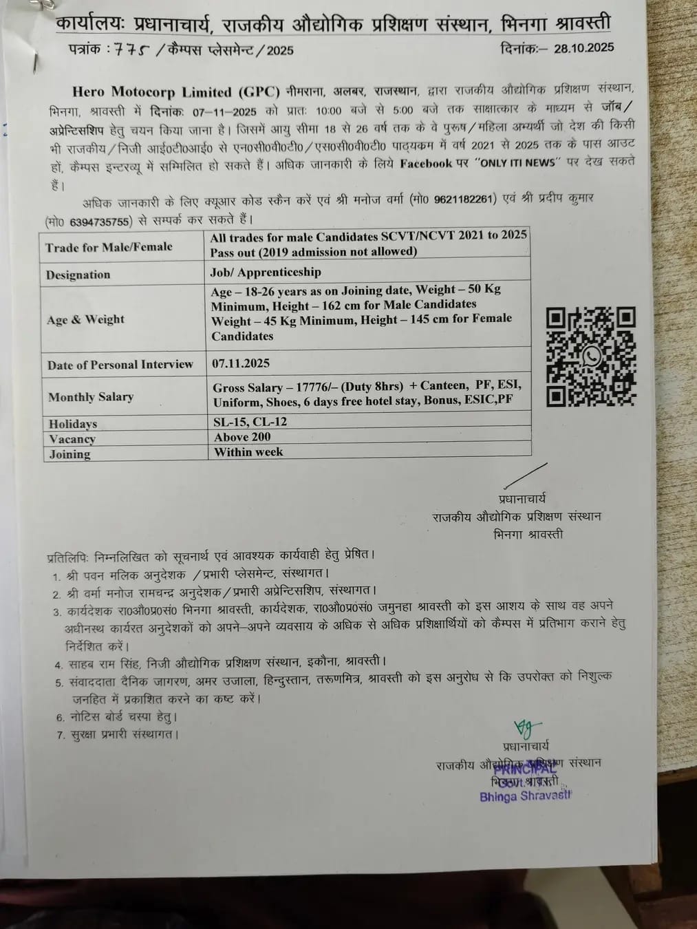 भारत की अग्रणी दोपहिया वाहन निर्माता कंपनी Hero MotoCorp Limited (GPC) नीमराना, अलवर, राजस्थान द्वारा राजकीय औद्योगिक प्रशिक्षण संस्थान, भिनगा (श्रावस्ती) में दिनांक 07 नवम्बर 2025 को भव्य कैम्पस प्लेसमेंट ड्राइव का आयोजन किया जा रहा है।